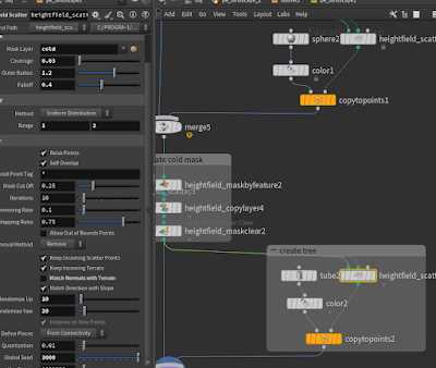 The first thing I did was create the terrain in Houdini. There was a dry area, a waterfall connecting the dry area to the bush area with cliffs, forest areas, ice areas, etc.